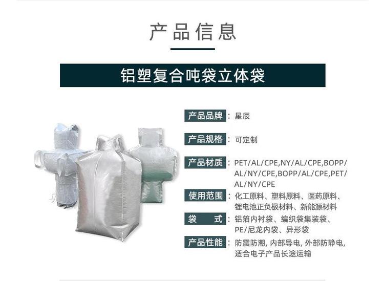 鋁箔噸袋主要應用于對于內容物有高阻隔要求以及***要求,尼龍粒子(例如PA6、PA66)、填充料、易吸水粉末、化工原料等產品