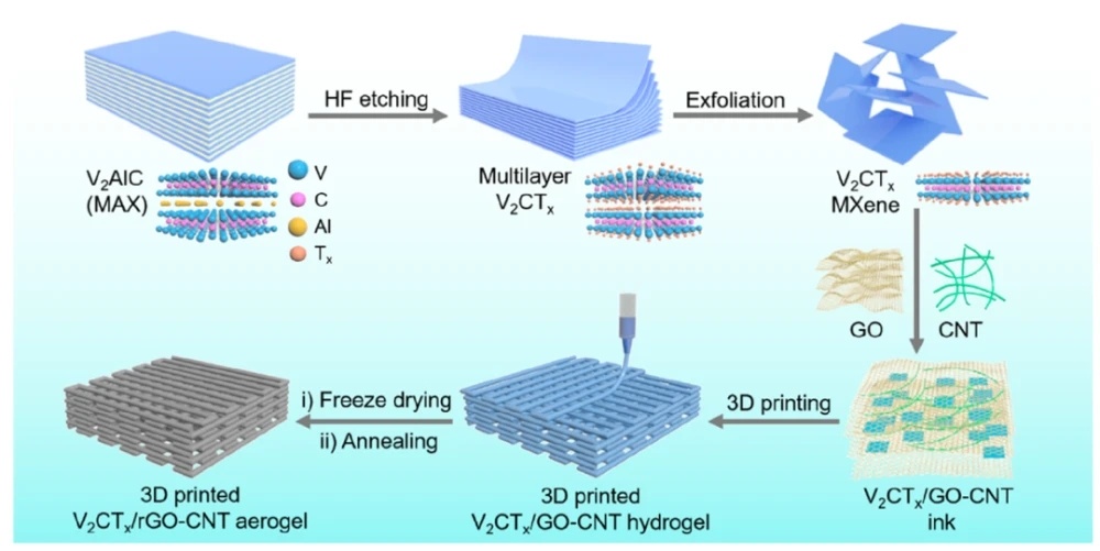 圖13D打印V2CTx/rGO-CNT微網格氣凝膠電極的制備過程