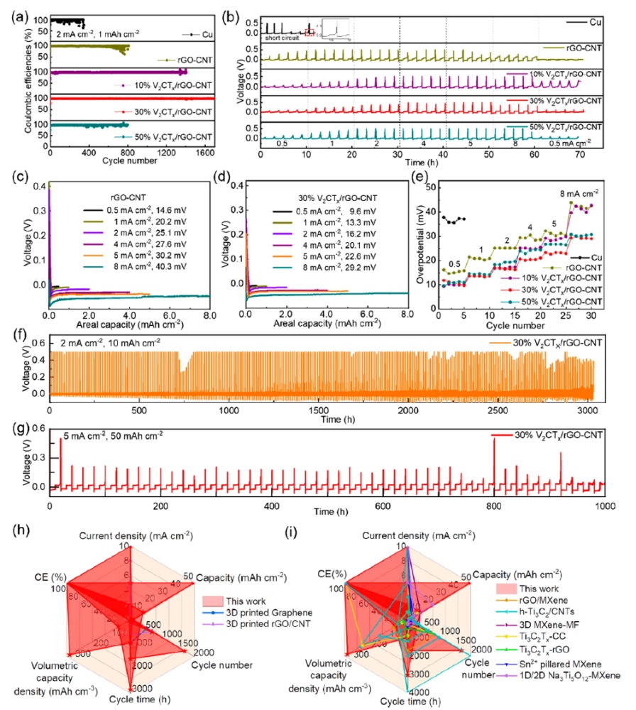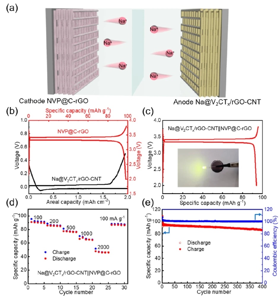 近日,鄭州大學王燁教授、徐俊敏副教授、新加坡科技設計大學(SUTD)楊會穎副教授通過直接墨寫3D打印技術制備了一種人工三維分級多孔親鈉性V2CTx/rGO-CNT微網格氣凝膠,并進一步將其用作Na金屬的基體以獲得Na@V2CTx/rGO-CNT鈉金屬負極。實驗顯示,V2CTx/rGO-CNT電極可在2mAcm-2、10mAhcm-2下產生超過3000小時的優異循環壽命,平均庫侖效率為99.54%。更有吸引力的是,它甚至可以在5mAcm-2和50mAhcm-2的超高面容量下穩定運行超過900小時。此外,將Na@V2CTx/rGO-CNT負極與Na3V2(PO4)3@C-rGO正極配對的全電池可在100mAg-1下循環400次后提供86.27mAhg-1的高可逆容量。總之,這項工作不僅闡明了親鈉性V2CTx/rGO-CNT微網格氣凝膠電極上優異的鈉沉積化學,而且還提供了一種通過3D打印方法制備先進鈉金屬負極的方法。