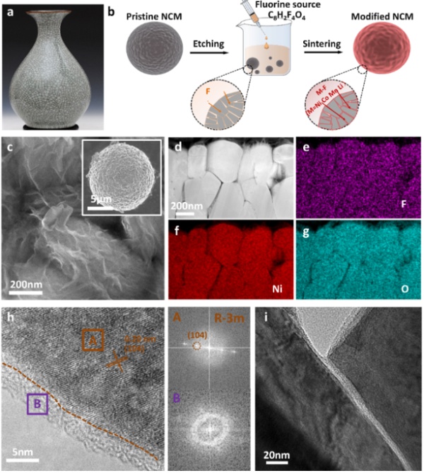 從中國傳統瓷器藝術品裂紋釉中獲得靈感,研究通過有機氟酸(四氟對苯二甲酸C8H2F4O4)刻蝕處理并結合高溫煅燒制備出金屬氟化物在一次/二次顆粒界面均勻包覆改性的LiNi0.8Co0.15Mn0.05O2正極。該方法顯著抑制材料晶間裂紋生長,提升了材料的長循環穩定性(25℃,100%@400圈;60℃,97%@200圈)。該方法也可以擴展應用至其他過渡金屬氧化物正極材料體系。相關研究成果以Amorphous fluorine glaze for crack-freenickel-richlayered cathode grains under electrochemical cycling為題發表于Chemical Engineering Journal。