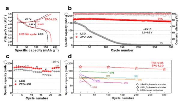 隨著鋰離子電池儲能體系向高緯度、高海拔地區等應用場景的拓展,對正極材料的低溫性能提出更高要求。通過一種新穎且簡便的軟化學法在LiCoO2表面上均勻包覆一層厚度約為5nm的非晶磷酸鋯層,可有效改善其在低溫環境的使用性能。得益于較高的界面相容性和更小的極化程度,改性材料在-25℃和4.6V下表現出179.2mAhg-1的高可逆比容量和優越的循環穩定性(91%@300圈)。通過EIS阻抗、接觸角、GITT和TEM表征,證明改性材料表面的非晶包覆層對構建浸潤性好、離子電導率高和穩定性強的固液電解質界面具有積極效果。相關研究成果以Constructing Robust Cathode/Electrolyte Interphase for Ultrastable 4.6V LiCoO2 under -25℃為題發表于ACS Applied Materials&Interfaces。