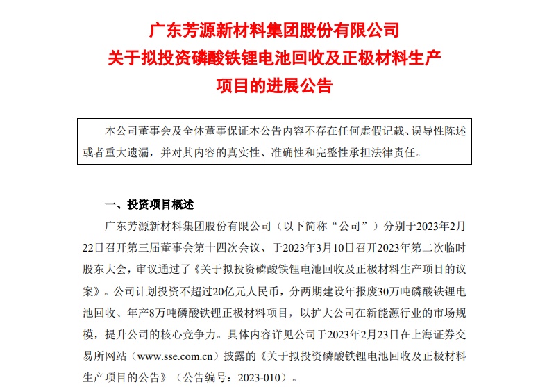 芳源股份于5月23日發布公告稱,廣東芳源新材料集團股份有限公司(以下簡稱“公司”)分別于2023年2月22日召開第三屆董事會第十四次會議、于2023年3月10日召開2023年第二次臨時股東大會,審議通過了《關于擬投資磷酸鐵鋰電池回收及正極材料生產項目的議案》。公司計劃投資不超過20億元人民幣,分兩期建設年報廢30萬噸磷酸鐵鋰電池回收、年產8萬噸磷酸鐵鋰正極材料項目,以擴大公司在新能源行業的市場規模,提升公司的核心競爭力。