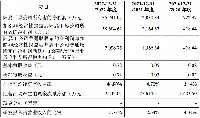 招股書顯示,公司是一家專注于錳基正極材料研發、生產和銷售的高新技術企業,報告期內公司主要產品為錳酸鋰,包括容量型錳酸鋰、動力型錳酸鋰、倍率型錳酸鋰。2020年、2021年、2022年,公司實現營業收入分別為1.30億元、7.58億元、27.14億元,同期實現歸屬于歸屬于母公司所有者的凈利潤分別為722.47萬元、2030.34萬元、3.52億元。