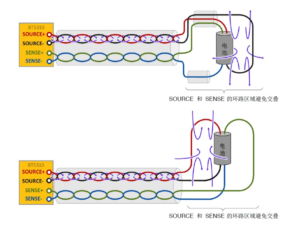 在靠近電池的位置,不可避免地,由SOURCE線和SENSE線各自圍成一個環路區域,環路區域的交疊部分具有明顯的電磁感應現象。若此區域附近存在導體,將容易產生渦流,引入誤差。參考下面SOURCE與SENSE的環路區域走線方式,可以盡量避免交疊,可以減輕渦流的影響。