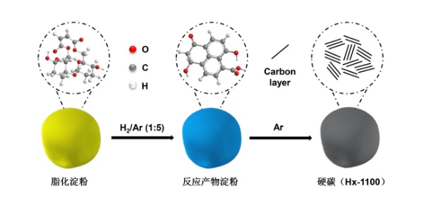 中國科學(xué)院山西煤炭化學(xué)研究所的陳成猛研究員領(lǐng)銜團(tuán)隊,利用富含氧元素的酯化淀粉,通過化學(xué)反應(yīng)制備了一種鈉離子電池負(fù)極材料——硬碳,并研究了反應(yīng)中間產(chǎn)物前驅(qū)體的氧元素含量對該硬碳負(fù)極材料電化學(xué)性能的影響。