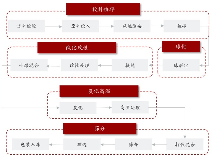 天然石墨負極原材料主要為鱗片石墨,其加工工藝主要包括球形化、改性處理、炭化高溫等。