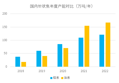 針狀焦起源于海外,存在一定技術壁壘,核心技術仍掌握在海外廠商手中。目前,國產針狀焦中低端產能偏多,中高端供應嚴重不足。從數據上看,國內針狀焦產能持續攀升,從2018年到2022年,復合增速率達52%。從2021年開始,油系針狀焦的產能超過煤系。