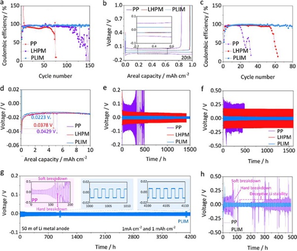 研究表明,該隔膜可有效、快速傳遞鋰離子,同時能抑制鋰鹽陰離子的通過,從而實現鋰離子在鋰金屬負極表面均勻、定向沉積,改善了電池的界面穩定性和循環穩定性(圖2)。此外,該隔膜展示了超親電解液性能、高的電解液吸液率和保留率、良好的熱穩定性和阻燃性能。科研人員將該隔膜應用于鋰-硫電池和鋰-磷酸鐵鋰電池時,在室溫或高溫條件下均表現出優異的循環穩定性和倍率性能等。