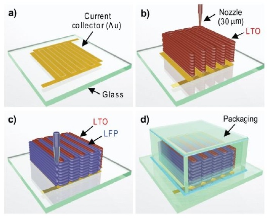 哈佛大學科學家3D打印鋰電池示意圖(來源:許豐,《低溫直寫3D打印制備鋰離子電池高負載量多孔電極技術的研究》)