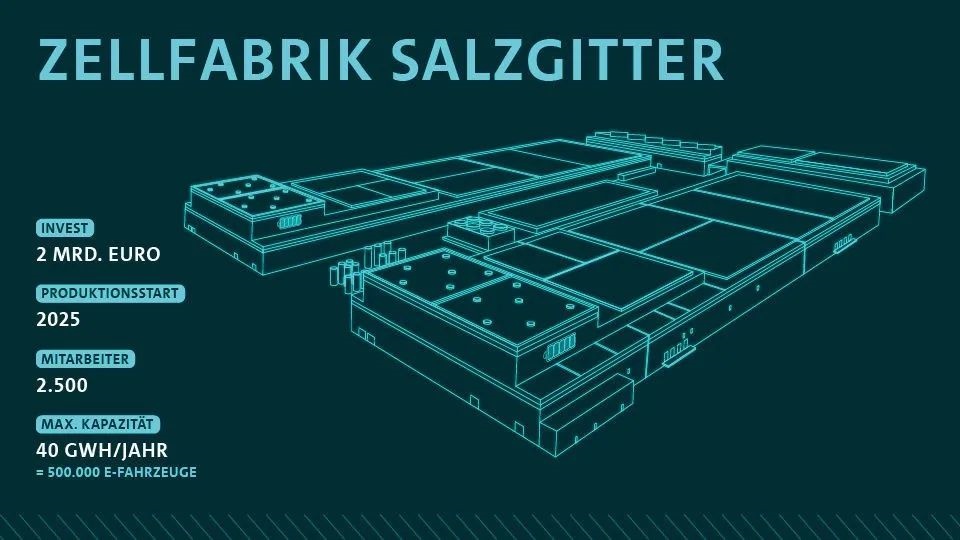近期德國薩爾茨基特(Salzgitter)新電池廠破土動工,這是大眾首座歐洲電池工廠。整個投資約20億歐元,計劃在2025年投產,在滿負荷運轉下將能夠生產40GWh的動力電池,供給50萬輛電動汽車。