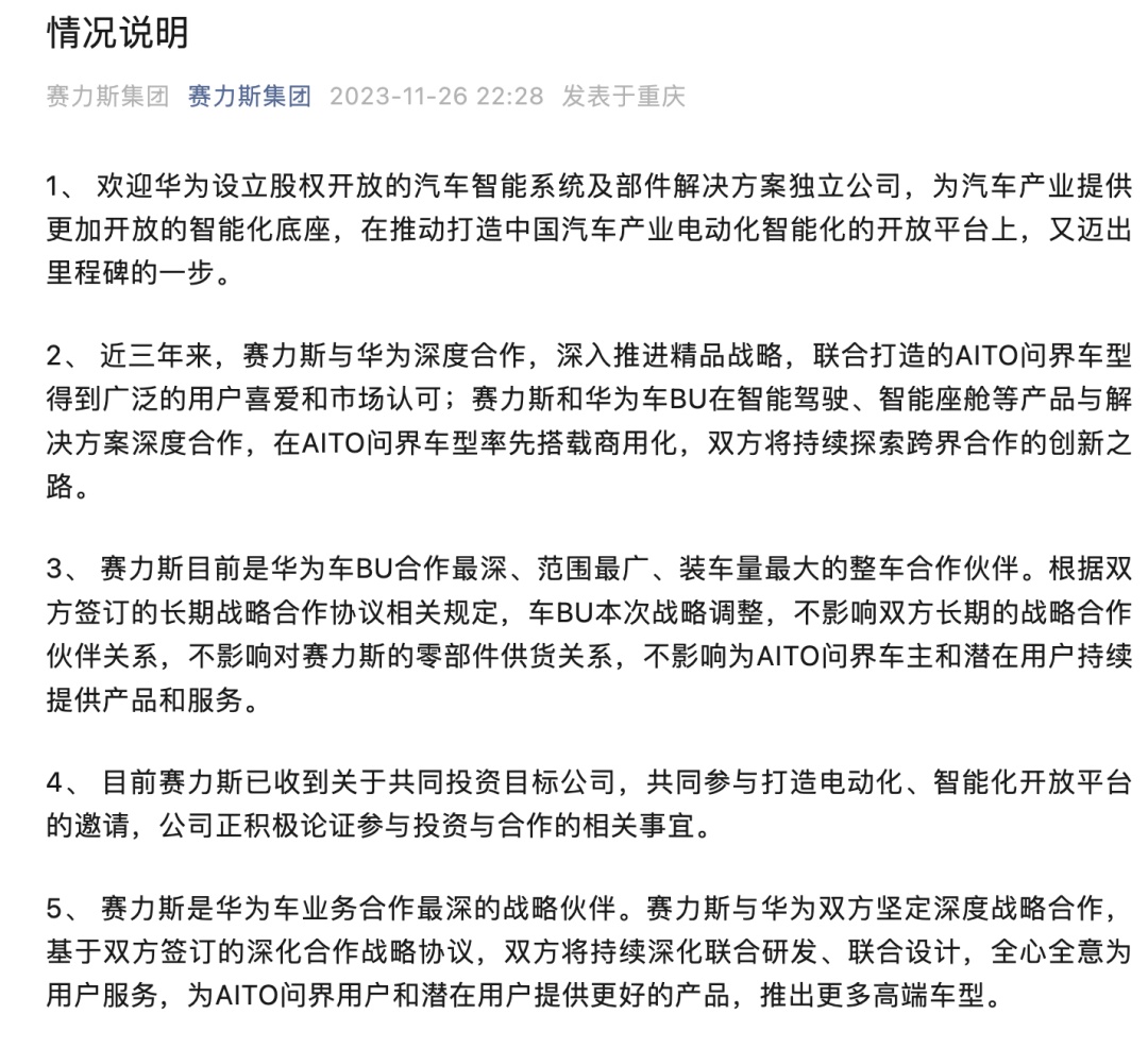 針對長安汽車與華為簽約,是否會影響到賽力斯的地位,賽力斯發布聲明稱,華為車BU本次戰略調整,不影響雙方長期的戰略合作伙伴關系,不影響對賽力斯的零部件供貨關系,不影響為AITO問界車主和潛在用戶持續提供產品和服務。目前賽力斯已收到關于共同投資目標公司,共同參與打造電動化、智能化開放平臺的邀請,公司正積極論證參與投資與合作的相關事宜。