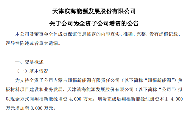 12月25日晚間,濱海能源發(fā)布公告稱,為支持全資子公司內(nèi)蒙古翔福新能源有限責(zé)任公司(以下簡稱“翔福新能源”)負(fù)極材料項目建設(shè)和業(yè)務(wù)發(fā)展,公司擬以現(xiàn)金方式向翔福新能源增資4,000萬元,增資完成后翔福新能源注冊資本由4,000萬元增加至8,000萬元。