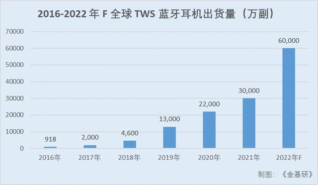 同時,2021年全球TWS藍牙耳機出貨量達到3億副,2022年出貨量將迅速增長至6億副,2019-2022年間的復合增長率將達66.5%。