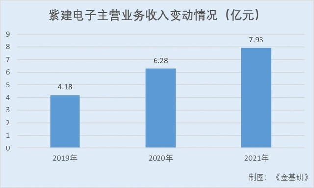 據東方財富Choice數據,2019-2021年,紫建電子的營業收入分別為4.21億元、6.39億元、7.99億元。