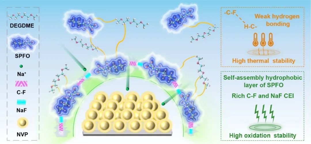 針對(duì)上述問題,研究團(tuán)隊(duì)利用全氟陰離子與正極和溶劑之間的相互作用,設(shè)計(jì)并開發(fā)了系列含全氟陰離子添加劑的醚類電解液體系。研究發(fā)現(xiàn),添加劑和正極間的強(qiáng)親和作用,可發(fā)生優(yōu)先吸附,減少了自由溶劑分子與電極間的接觸;同時(shí),高HOMO能級(jí)可作為自犧牲劑優(yōu)先于溶劑氧化,形成富含C-F/NaF的CEI界面,改善了醚類電解液的抗氧化性和界面鈉擴(kuò)散動(dòng)力學(xué),實(shí)現(xiàn)了醚類電解液耐受電壓由3.6V提高至4.5V(vs.Na/Na+),循環(huán)1900次后容量保持率高達(dá)91%。此外,團(tuán)隊(duì)還發(fā)現(xiàn),全氟陰離子添加劑和醚類溶劑之間形成的-C-F··H-C-贗氫鍵,可以顯著改善電解液的熱穩(wěn)定性,在60 °C下穩(wěn)定循環(huán)100次后容量基本無衰減。該新型醚類電解液體系開發(fā)不僅為鈉離子電池界面化學(xué)調(diào)控提供了創(chuàng)新的設(shè)計(jì)思路,而且對(duì)拓寬醚類電解液體系在鈉離子電池中的實(shí)際應(yīng)用提供了新思路。