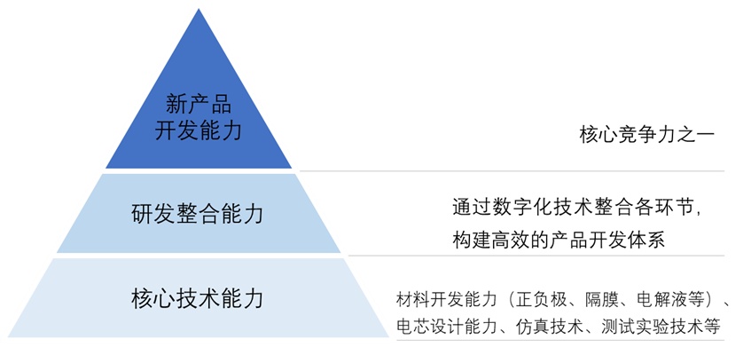 新產品開發主要依托企業的核心技術能力進行,因此圖中新產品開發能力金字塔的底層是各類核心技術能力,在電池行業領域,包括電芯設計能力、包含正負極、隔膜、電解液等材料在內的材料開發能力、電化學仿真能力、材料計算能力、測試實驗能力、生產工藝能力(包括燒結包覆)等等。