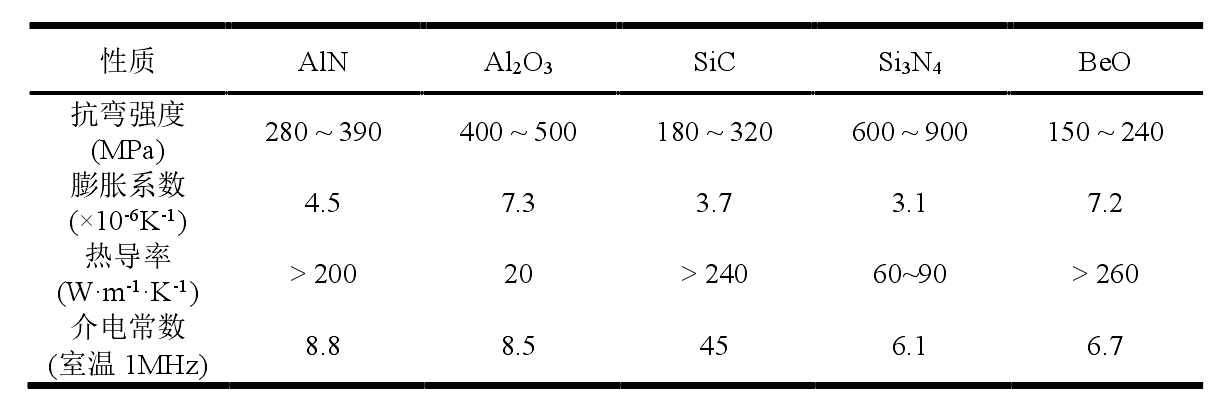 BeO陶瓷基板雖然具有較高的熱導率和較低的介電常數,滿足高效散熱的要求,但是由于其具有毒性,對工作人員的健康產生影響,不利于大規模應用。