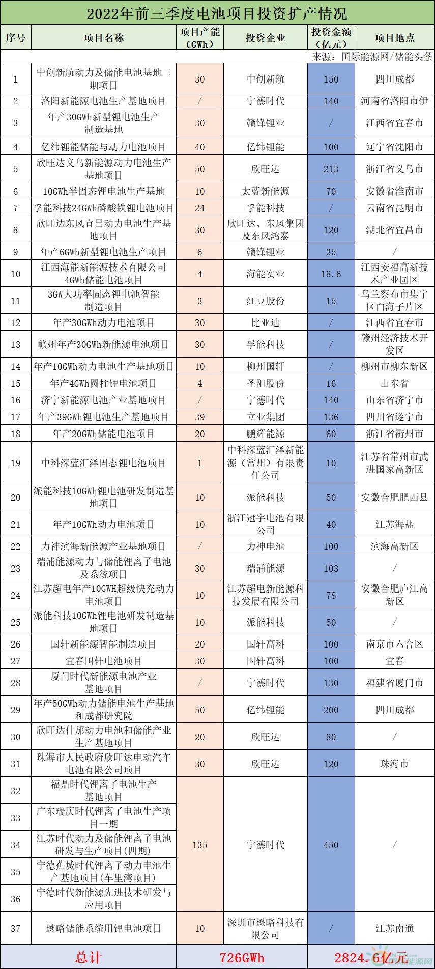 進(jìn)入2022年之后,國(guó)內(nèi)電池新能源產(chǎn)業(yè)鏈企業(yè)擴(kuò)產(chǎn)、簽約的利好消息接連不斷。據(jù)國(guó)際能源網(wǎng)/儲(chǔ)能頭條不完全統(tǒng)計(jì)不完全統(tǒng)計(jì),2022年前三季度,以比亞迪、欣旺達(dá)、中創(chuàng)新航、億緯鋰能等為代表的鋰電池企業(yè)相繼公布了多個(gè)新投建項(xiàng)目,整體投建資金超2824.6億元,建設(shè)年產(chǎn)能達(dá)726GWh(部分項(xiàng)目未披露投資金額及產(chǎn)能),較去年同期相比擴(kuò)產(chǎn)步伐進(jìn)一步加速。