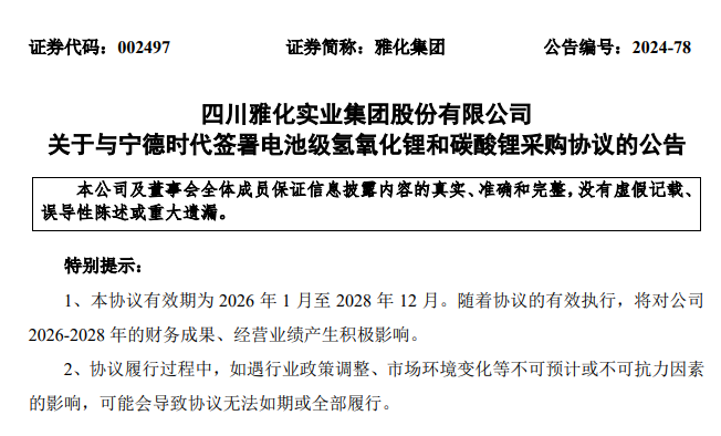 繼6月份與特斯拉簽署三年的碳酸鋰采購協(xié)議后,9月4日晚間,雅化集團(tuán)公告稱,公司全資子公司雅化鋰業(yè)(雅安)有限公司(以下簡稱雅安鋰業(yè))與寧德時(shí)代簽訂采購協(xié)議,寧德時(shí)代將從2026年1月至2028年12月,向雅安鋰業(yè)采購電池級(jí)氫氧化鋰和碳酸鋰產(chǎn)品。
