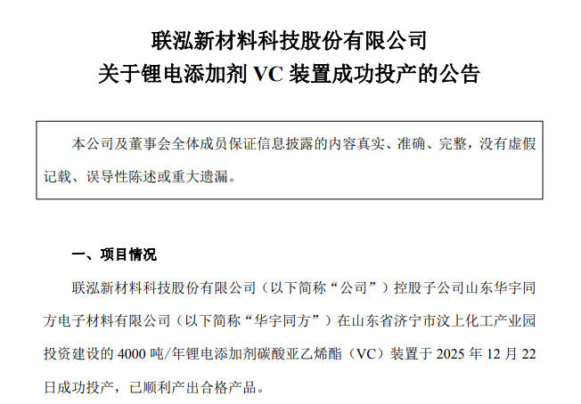 12月23日午間,聯(lián)泓新科公告稱,公司控股子公司山東華宇同方電子材料有限公司在山東省濟(jì)寧市汶上化工產(chǎn)業(yè)園投資建設(shè)的4000噸/年鋰電添加劑碳酸亞乙烯酯(VC)裝置于12月22日成功投產(chǎn),已順利產(chǎn)出合格產(chǎn)品。