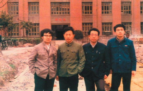 1986年李永舫(左二)在復旦大學躍進樓前與研究生同學胡震東、戚小鶴和沈陽合影
