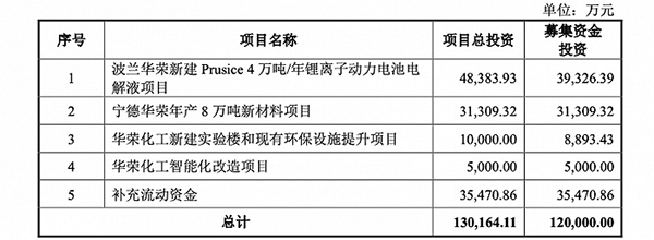 首次IPO,瑞泰新材計(jì)劃募資12億元,其中,3.93億元將用于波蘭華榮新建Prusice4萬噸/年鋰離子動力電池電解液項(xiàng)目,3.13億元將用于寧德華榮年產(chǎn)8萬噸新材料項(xiàng)目,0.89億元將用于華榮化工新建實(shí)驗(yàn)樓和現(xiàn)有環(huán)保設(shè)施提升項(xiàng)目,0.50億元將用于華榮化工智能化改造項(xiàng)目,以及3.55億元將用于補(bǔ)充流動資金。