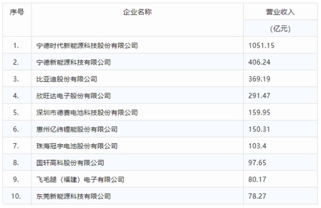 根據(jù)中國化學(xué)與物理電源行業(yè)協(xié)會日前發(fā)布的2021年國內(nèi)鋰離子電池企業(yè)營收(僅統(tǒng)計鋰離子電芯及動力用、消費類產(chǎn)品用和儲能用鋰離子電池模組或系統(tǒng))排名名單,前十強企業(yè)分別是: