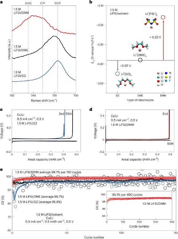 Fig.3|ReversibleLiplating/strippingenabledbyelectrodepotentialupshiftinaweaklycoordinatingsolvent,DMM.