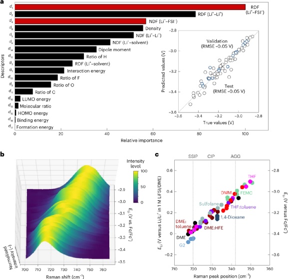 鑒于此,大阪大學Yuki Yamada教授聯合東京大學Atsuo Yamada教授等人報告了鋰沉積/剝離的CE很大程度上受鋰金屬的熱力學電極電位(ELi)的影響。具有高ELi的電解液會削弱鋰金屬的還原能力,可以最大限度地減少電解液的還原分解,從而帶來高CE。因此,反映Li還原能力的ELi可以通過調整Li+化學勢(μLi+)進行電解質設計來控制。研究人員測試了74種不同電解質中的ELi。總體而言,平均CE隨著ELi的增加而增加,這表明電解質的還原分解在高ELi時受到抑制(Li的還原能力較低)。基于機器學習的回歸分析表明,ELi很大程度上受Li+-FSI-相互作用的影響。相應地,ELi與FSI-的拉曼位移密切相關,這表明了Li+-FSI-離子配對的程度。這里需要注意的是,這項工作并沒有反駁SEI的貢獻,它在動力學上抑制了電解質的分解。離子對的形成可能會增加帶負電荷的負極表面上FSI-陰離子的濃度,從而促進FSI-衍生的SEI的形成并抑制SEI的膨脹。當Li+與FSI-陰離子配對時,ELi的偏移相當大(>0.6V),更高的ELi導致鋰金屬負極的CE更高。本文中發現的熱力學指標將為設計用于鋰金屬電池的下一代電解質提供新的機會。