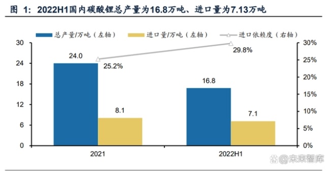 新能源產業推動鋰需求呈非線性高增,而產能釋放受限,供需錯配明顯。(1)需求 側:根據USGS數據,全球鋰需求量已從2015年的3.1萬噸金屬量提升至2021年的9.3 萬噸金屬量,新能源汽車、儲能產業的快速發展推動了鋰需求快速增長。(2)供給 側:全球ESG要求不斷提高、疫情、開發技術受限等因素影響,鋰資源開發進度難以匹配下游需求增長速度,當前鋰的供需結構仍呈錯配狀態。 我國鋰資源自供能力仍有不足,2022H1進口量大增近70%。根據工業和信息化部統計數據,2021年我國碳酸鋰總產量、進口量分別為24.0萬噸、8.1萬噸,2022H1國 內碳酸鋰總產量為16.8萬噸(同比+42%)、進口量為7.1萬噸(同比+67%)。若用 進口量/(總產量+進口量)簡單衡量鋰資源的進口依賴度,該比例已從2021年的25.2% 提升至2022H1的29.8%,我國鋰資源自供能力仍有不足。