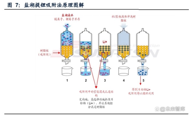 鋁系吸附劑已成功實現產業化,鈦系吸附劑已進行中試,錳系吸附劑尚處實驗室階 段。根據王琪等《高鎂鋰比鹽湖鎂鋰分離與鋰提取技術研究進展》(2021年),當 前吸附劑技術路線主要有三種:(1)鋁系吸附劑:廣泛應用于氯化物型、硫酸鎂亞 型鹽湖,吸附速率快,且脫附過程不需要消耗酸,循環穩定性較好,已成功應用于工 業化;(2)鈦系吸附劑:適用于氫氧根豐富的堿性鹽湖,在錳系的基礎上解決了溶 損率的問題,久吾高科首次將鈦系吸附劑在碳酸型鹽湖,目前處于中試階段;(3) 錳系吸附劑:適用于氫氧根豐富的堿性鹽湖,吸附容量大但溶損率高,廢水需要進 行環保處理,目前工業化過程受阻。