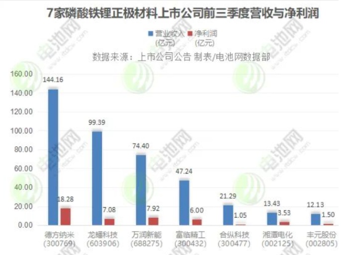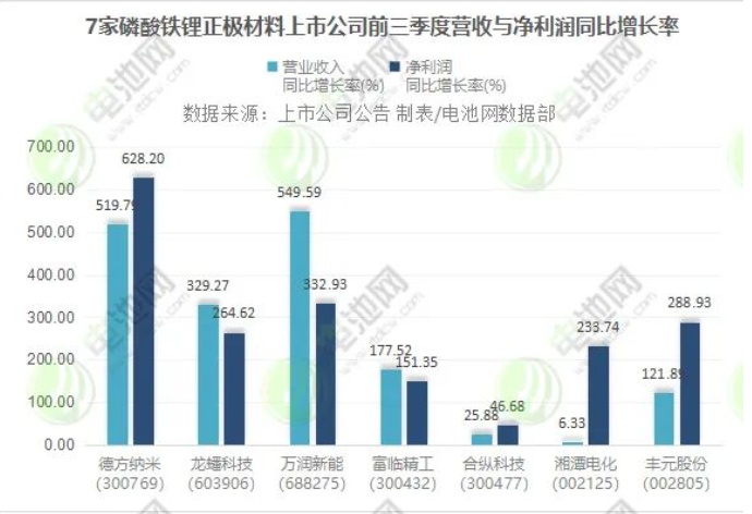 據資料統計在內的7家磷酸鐵鋰正極材料上市公司,前三季度營業收入與凈利潤均雙雙實現增長,營業收入合計達412億元,凈利潤合計超45億元。其中,德方納米、萬潤新能前三季度營業收入同比增逾5倍,德方納米前三季度凈利同比增逾6倍。