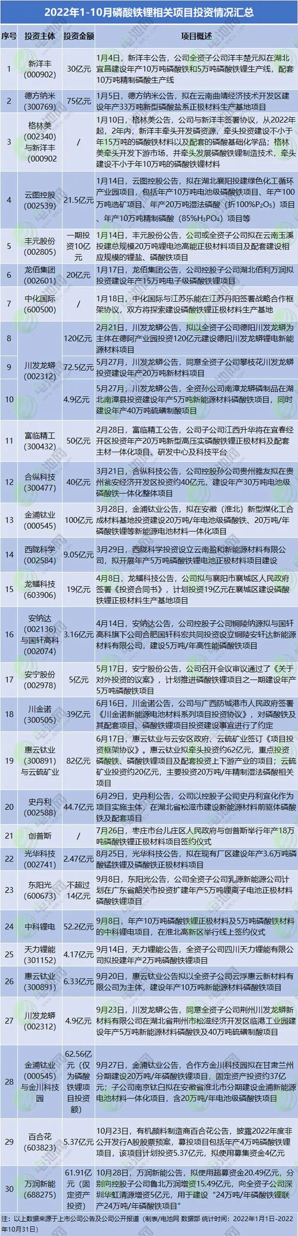 與此同時,云天化、中核鈦白、中銀絨業、鞍重股份、金浦鈦業、川發龍蟒、龍佰集團、司爾特、安納達、西隴科學、安寧股份、惠云鈦業、史丹利、東陽光、魯北化工等大量的化工及傳統能源領域上市公司也紛紛跨界布局磷酸鐵及磷酸鐵鋰材料賽道。
