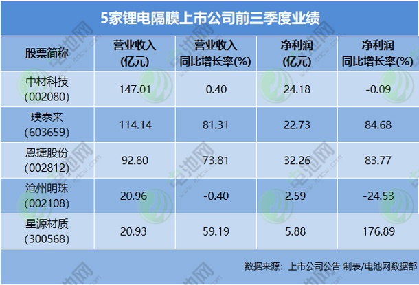 日前,鋰電隔膜上市公司悉數(shù)披露了三季報(bào),5家上市公司前三季度營(yíng)業(yè)收入總計(jì)約395.84億元,凈利潤(rùn)總計(jì)約87.64億元。