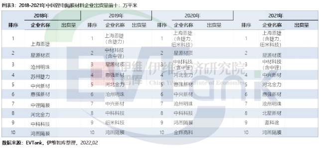 EVTank數(shù)據(jù)顯示,近三年來,國(guó)內(nèi)鋰電隔膜出貨量前三的上市公司分別是恩捷股份、星源材質(zhì)、中材科技。