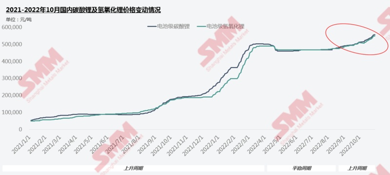 截至2022年11月1日的數(shù)據(jù),SMM電池級(jí)碳酸鋰價(jià)格區(qū)間來到了55-56.8萬元/噸,均價(jià)已貼近56萬元,再創(chuàng)新高。這次鋰價(jià)再次走高除了因?yàn)樗募径刃枨箢A(yù)期向好以外,還受到了鋰供應(yīng)鏈擾動(dòng)影響。供應(yīng)端,像9,10月青海疫情防控期間,當(dāng)?shù)佧}湖鋰散單貨源供給減少,長單交付出現(xiàn)擱置,有不少客戶到市場(chǎng)高價(jià)找貨,從而進(jìn)一步推高了鋰價(jià)。但從下游企業(yè)反饋,11-12月材料對(duì)鋰需求或逐步減少,總體來看,未來鋰鹽市場(chǎng)去庫情況緩解,甚至出現(xiàn)累庫狀態(tài),后市碳酸鋰價(jià)格或維穩(wěn)。