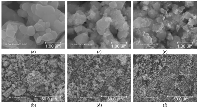 圖1.(a,b)TNO、(c,d)TNO-MA和(e,f)TNO/C在不同放大倍率下的SEM圖像。