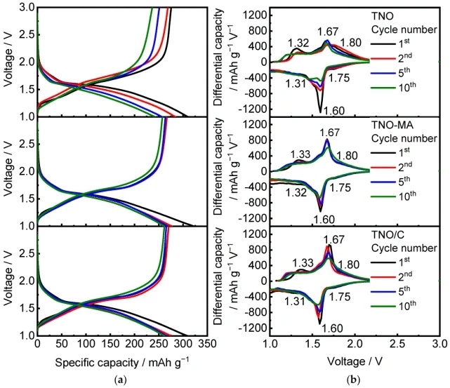 圖2.(a)充放電曲線和(b)TNO、TNO-MA和TNO/C相應的微分差容dQ/dV曲線。
