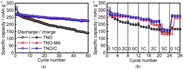 圖3.TNO、TNO-MA、TNO/C在1.0-3.0V范圍內(a)在C/10下的循環性能以及(b)倍率性能。