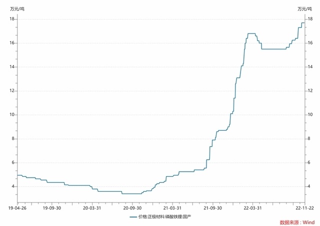 Wind數(shù)據(jù)顯示,去年磷酸鐵鋰的價格大幅上漲后,今年價格仍然維持在高位,近期的價格一度接近18萬元/噸。