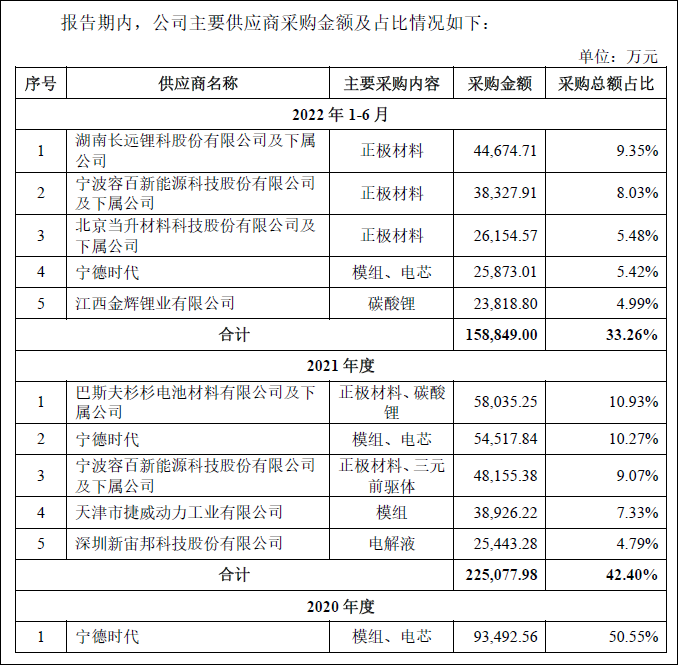 蜂巢能源主要供應商采購金額及占比 數據來源:蜂巢能源招股書