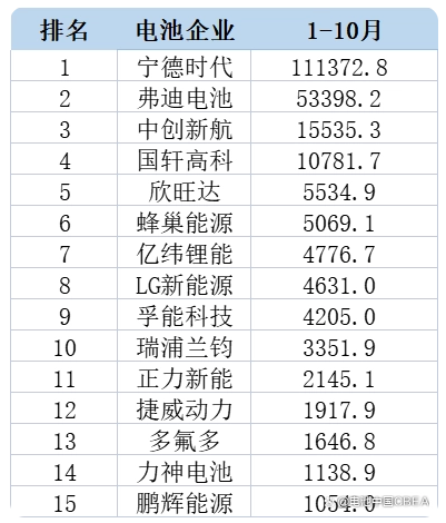 今年1-10月中國市場動力電池裝機量TOP15