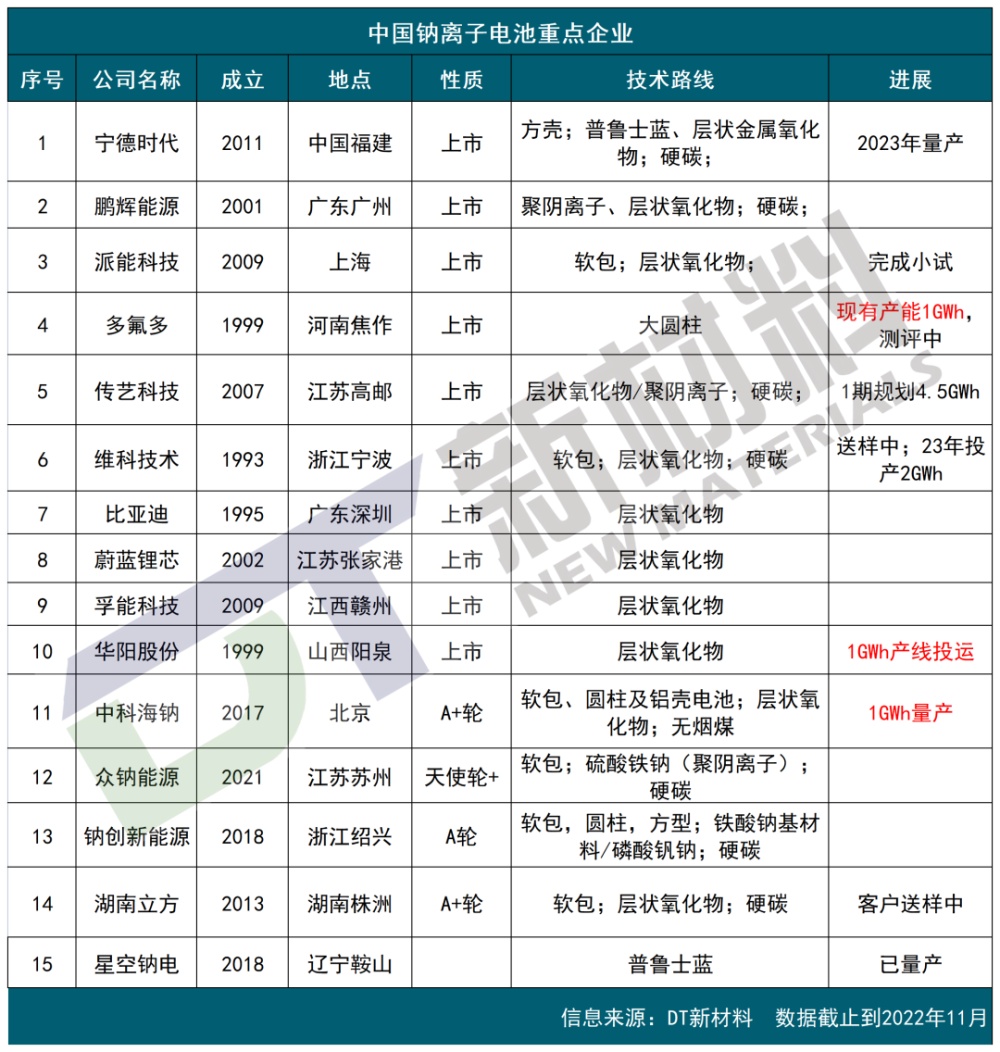 據(jù)統(tǒng)計(jì),目前有15家鈉電企業(yè),13家負(fù)極材料和19家正極材料企業(yè)官宣。另外還有許多宣布聯(lián)合高校進(jìn)軍鈉電池的企業(yè)還在路上,本次未統(tǒng)計(jì)。