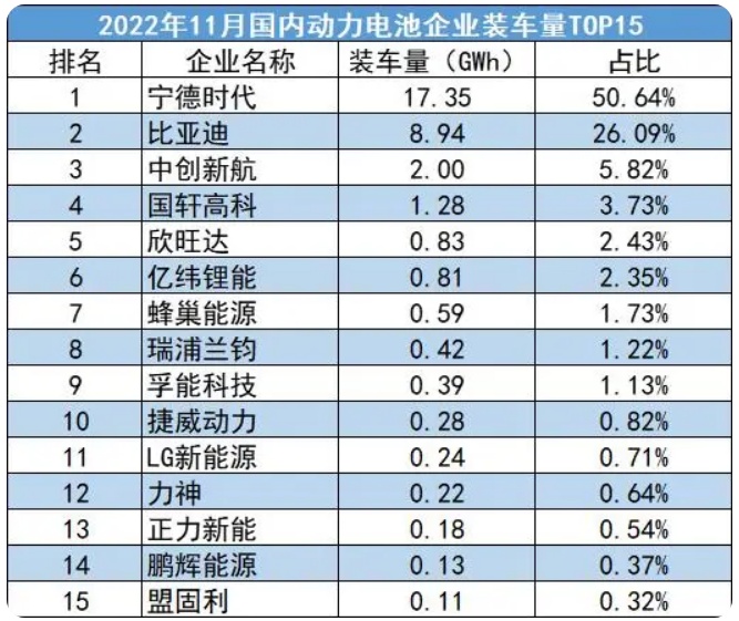 有觀點指出,本月寧德時代市占率的重新拉高,得益于其第一大客戶特斯拉的銷量爆發。該觀點稱,1—11月,寧德時代累計市占率為48.02%,若特斯拉銷量能在12月繼續保持高增長態勢,2022年寧德時代國內總體裝車量占比則有機會超過50%。而比亞迪的亮眼成績則在很大程度上歸功于其“自產自銷”的策略。數據顯示,11月,比亞迪新能源汽車銷量達到23.04萬輛,同比大漲152.63%,單月銷量再次創下歷史新高。同時,比亞迪電池也在不斷拓展外供車企客戶。比亞迪董事長王傳福曾表示:“幾乎能想得到的汽車品牌都在和我們談合作。”