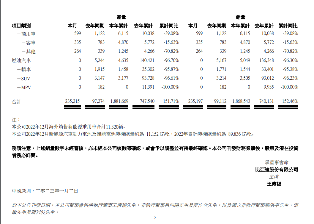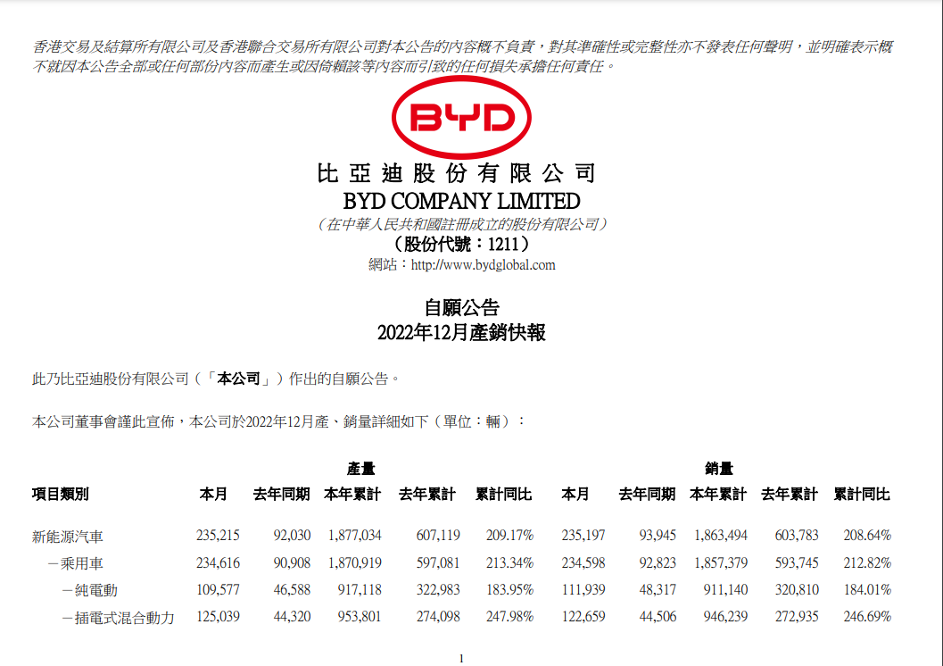 比亞迪股份(HK1211)2023年1月2日晚間在港交所發布公告,公司2022年12月新能源汽車產量23.52萬輛;2022年累計銷售186.35萬輛,同比增長208.64%。