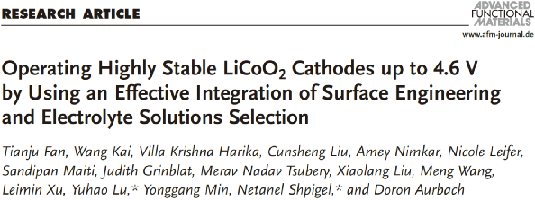 為了實現(xiàn)4.6V鈷酸鋰正極的穩(wěn)定循環(huán),以色列巴伊蘭大學(xué)Netanel Shpigel聯(lián)合中國寧德新能源(ATL)魯宇浩博士等人提出了一個復(fù)合策略,即對鈷酸鋰正極進(jìn)行Li3AlF6包覆,并采用高度適配的電解液(1MLiPF6 DFEC/FEC/DMC1/1/8),成功提升了該材料的高壓穩(wěn)定性,循環(huán)500周后容量保持率高達(dá)78%。相關(guān)文章以“Operating Highly Stable LiCoO2 Cathodes up to 4.6V by Using an Effective Integration of Surface Engineering and Electrolyte Solutions Selection”為題發(fā)表在國際知名期刊“Advanced Functional Materials”上。