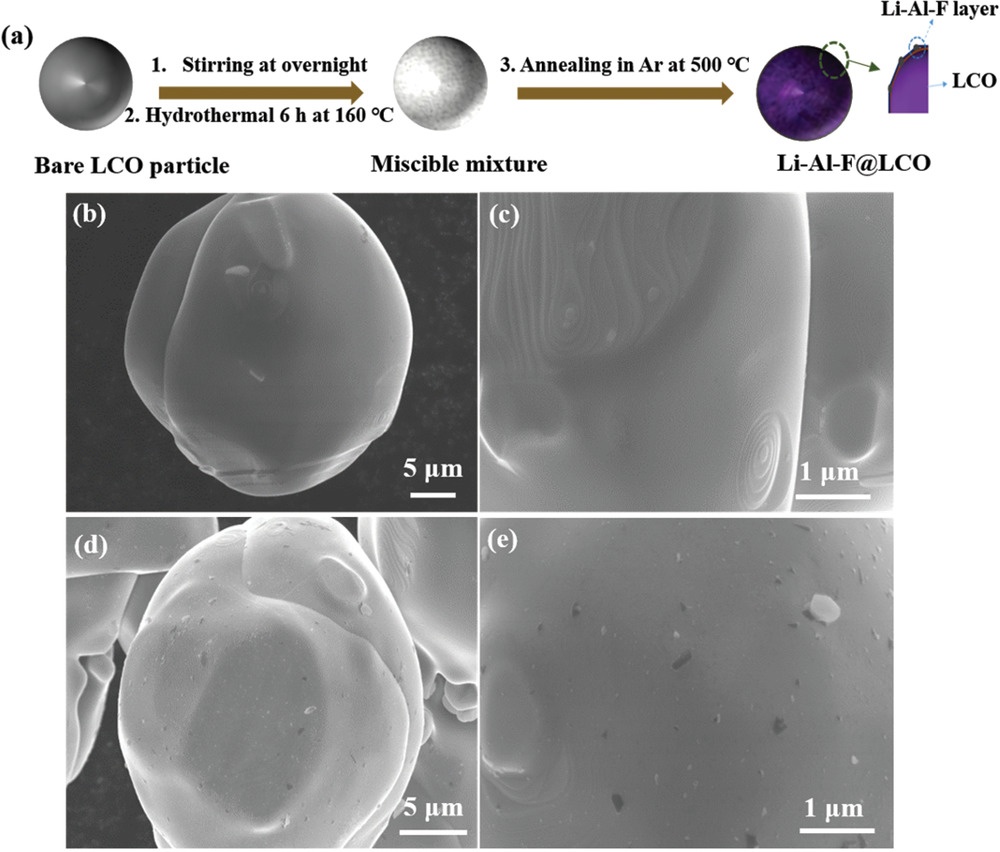 圖1.a)Li-Al-F@LCO的制備示意圖;b,c)Bare-LCO和d,e)Li-Al-F@LCO的SEM圖像
