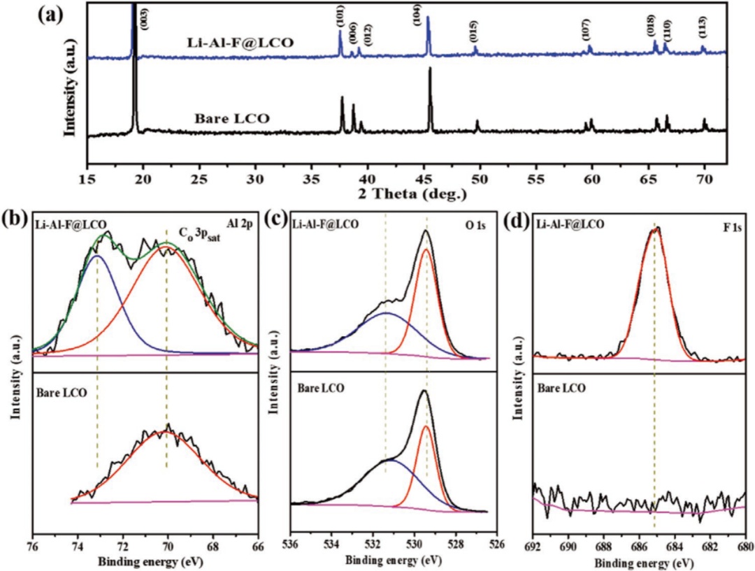 圖3.Bare-LCO和Li-Al-F@LCO顆粒的a)XRD和XPSb)Al2p,c)O1s,d)F1s光譜