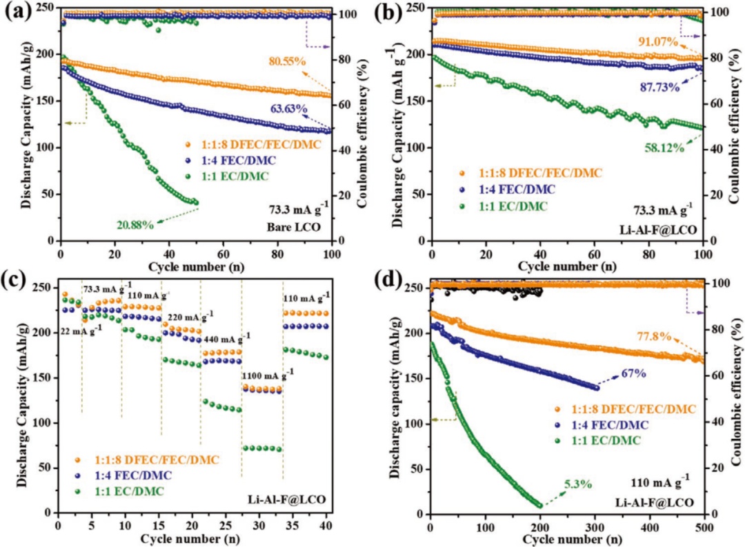 氟化電解液,憑借本身的電化學(xué)穩(wěn)定性及形成鈍化界面的能力,能夠很好的穩(wěn)定高壓正極,因此,作者研究了配方為1MLiPF6FEC/DMC1/4及1MLiPF6inDFEC/FEC/DMC1/1/8兩種氟化電解液與常規(guī)電解液(1MLiPF6EC/DMC1/1)的性能差異。對比圖4a,b可知:1)Li-AL-F包覆層有效地提升了LCO正極材料的高壓循環(huán)穩(wěn)定性;2)使用氟化電解液,尤其是DFEC/FEC復(fù)合氟化體系,能夠進(jìn)一步提升LCO的循環(huán)穩(wěn)定性。具體地:DFEC/FEC氟化電解液在0.3C循環(huán)100圈后容量保持率為91%,高于FEC體系的88%及EC體系的42%。DFEC/FEC氟化電解液同時具有更好的倍率性能,對于0.5C下的長循環(huán)性能,DFEC/FEC氟化電解液也有更優(yōu)異的表現(xiàn),初始容量達(dá)到220mAh/g,循環(huán)500周后容量保持率為78%,EC體系則在循環(huán)200周后衰減到5%。