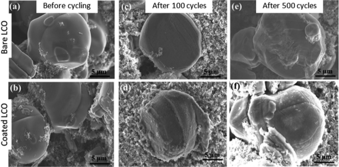 圖5展示了兩種材料在循環(huán)前、循環(huán)100及500圈后的SEM圖像,未包覆材料在循環(huán)100周后出現(xiàn)了明顯的破裂,而包覆材料同樣也出現(xiàn)了裂痕,但這些裂痕都被致密的鈍化膜覆蓋住了,這說明該體系中產(chǎn)生的裂紋能夠被迅速生成的鈍化膜修復(fù)完好,是一種自愈的過程。